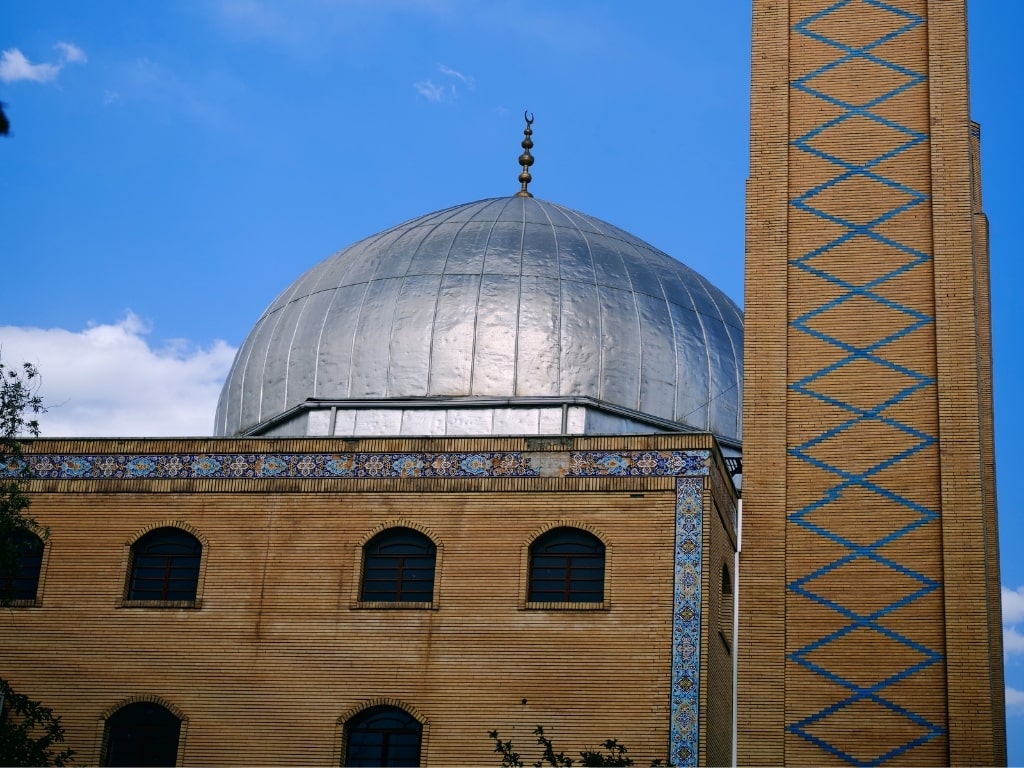 The mosque was built for the Naxçivan Ja’fari community in honor of the name of Hazrat Fatima. Its dome and two minarets combine modern structures with traditional features, as does the calligraphy inside. The men’s section is more lavishly decorated, while the women’s section remains simple.